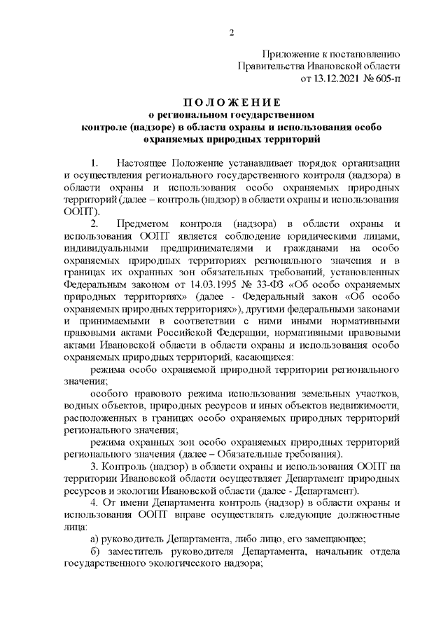 Постановление Правительства Ивановской области от 13.12.2021 N 605-п "Об утверждении Положения о региональном государственном контроле (надзоре) в области охраны и использования особо охраняемых природных территорий"