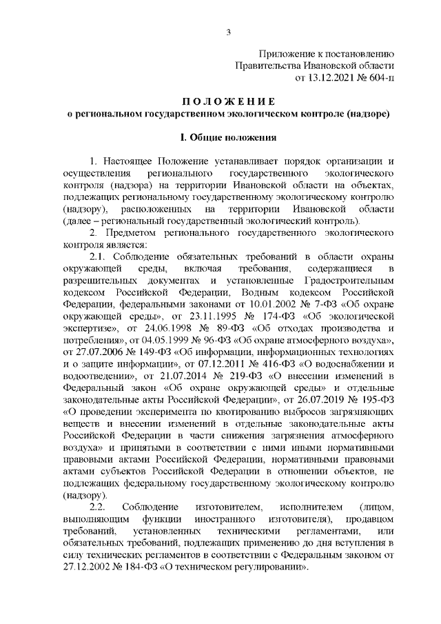 Постановление Правительства Ивановской области от 13.12.2021 N 604-п "Об утверждении Положения о региональном государственном экологическом контроле (надзоре) и признании утратившими силу некоторых постановлений Правительства Ивановской области"