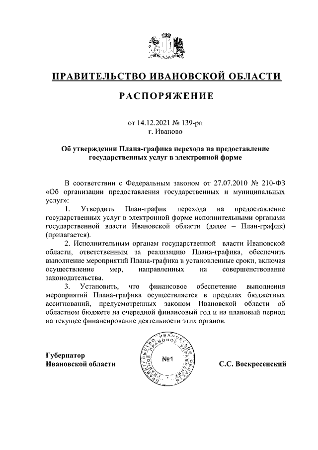 Распоряжение Правительства Ивановской области от 14.12.2021 N 139-рп "Об утверждении Плана-графика перехода на предоставление государственных услуг в электронной форме"