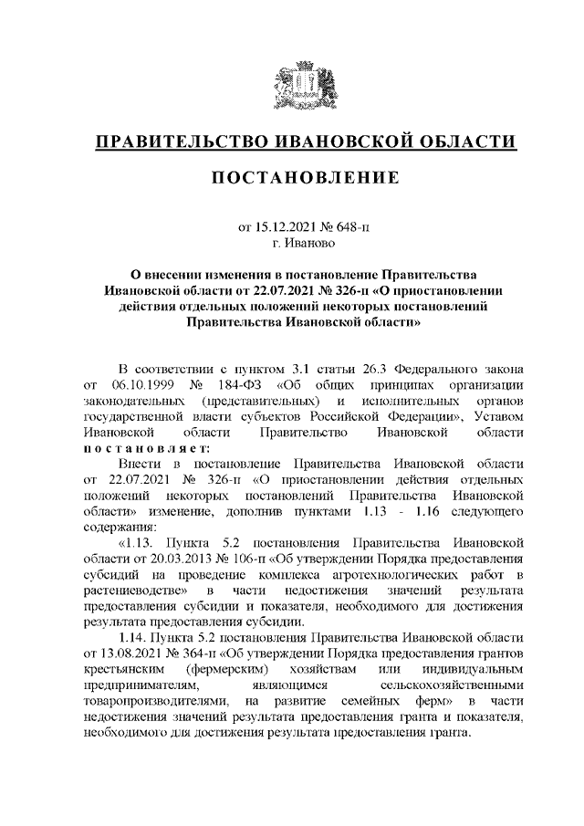 Постановление Правительства Ивановской области от 15.12.2021 N 648-п "О внесении изменения в постановление Правительства Ивановской области от 22.07.2021 N 326-п "О приостановлении действия отдельных положений некоторых постановлений Правительства Ивановской области"