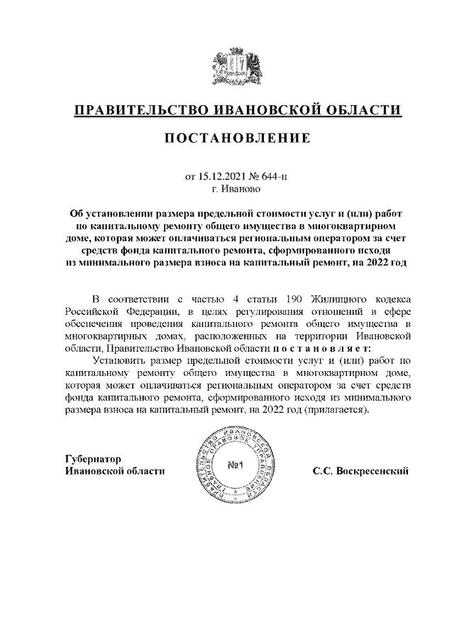 Постановление Правительства Ивановской области от 15.12.2021 N 644-п "Об установлении размера предельной стоимости услуг и (или) работ по капитальному ремонту общего имущества в многоквартирном доме, которая может оплачиваться региональным оператором за счет средств фонда капитального ремонта, сформированного исходя из минимального размера взноса на капитальный ремонт, на 2022 год"