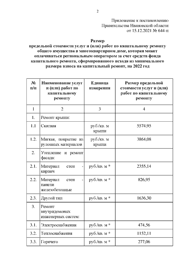 Постановление Правительства Ивановской области от 15.12.2021 N 644-п "Об установлении размера предельной стоимости услуг и (или) работ по капитальному ремонту общего имущества в многоквартирном доме, которая может оплачиваться региональным оператором за счет средств фонда капитального ремонта, сформированного исходя из минимального размера взноса на капитальный ремонт, на 2022 год"