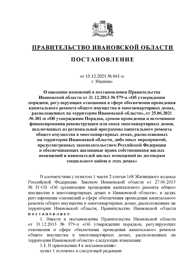 Постановление Правительства Ивановской области от 15.12.2021 N 641-п "О внесении изменений в постановления Правительства Ивановской области от 31.12.2013 N 579-п "Об утверждении порядков, регулирующих отношения в сфере обеспечения проведения капитального ремонта общего имущества в многоквартирных домах, расположенных на территории Ивановской области", от 25.06.2021 N 301-п "Об утверждении Порядка, сроков проведения и источников финансирования реконструкции или сноса многоквартирных домов, исключенных из региональной программы капитального ремонта общего имущества в многоквартирных домах, расположенных на территории Ивановской области, либо иных мероприятий, предусмотренных законодательством Российской Федерации и обеспечивающих жилищные права собственников жилых помещений и нанимателей жилых помещений по договорам социального найма в этих домах"