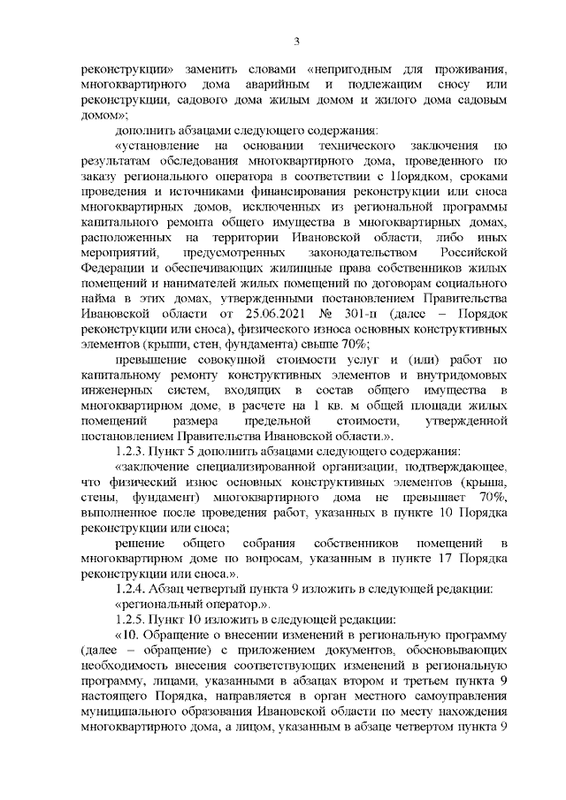 Постановление Правительства Ивановской области от 15.12.2021 N 641-п "О внесении изменений в постановления Правительства Ивановской области от 31.12.2013 N 579-п "Об утверждении порядков, регулирующих отношения в сфере обеспечения проведения капитального ремонта общего имущества в многоквартирных домах, расположенных на территории Ивановской области", от 25.06.2021 N 301-п "Об утверждении Порядка, сроков проведения и источников финансирования реконструкции или сноса многоквартирных домов, исключенных из региональной программы капитального ремонта общего имущества в многоквартирных домах, расположенных на территории Ивановской области, либо иных мероприятий, предусмотренных законодательством Российской Федерации и обеспечивающих жилищные права собственников жилых помещений и нанимателей жилых помещений по договорам социального найма в этих домах"