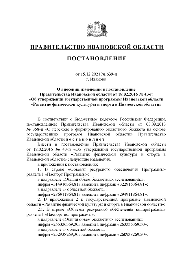 Постановление Правительства Ивановской области от 15.12.2021 N 639-п "О внесении изменений в постановление Правительства Ивановской области от 18.02.2016 N 43-п "Об утверждении государственной программы Ивановской области "Развитие физической культуры и спорта в Ивановской области"