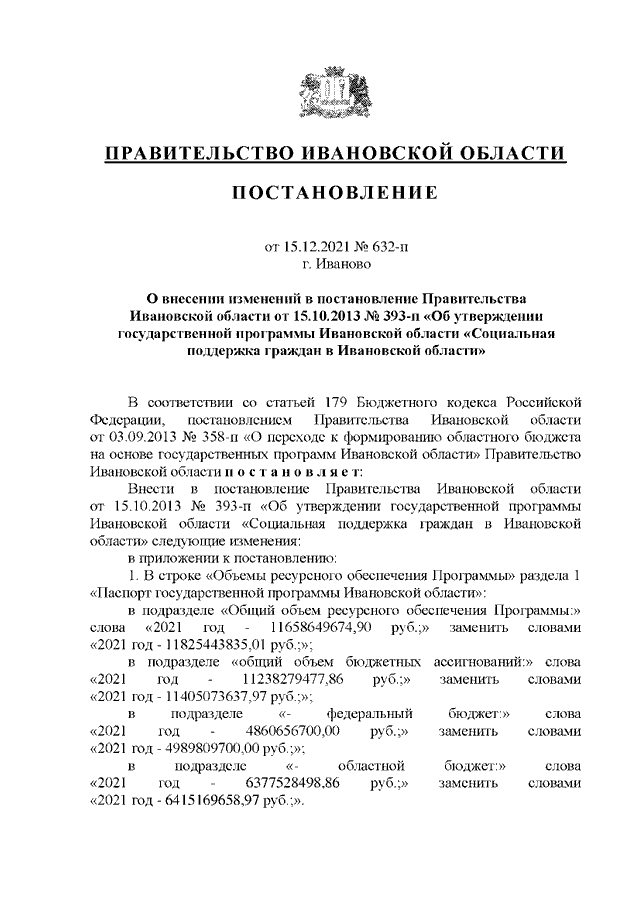 Постановление Правительства Ивановской области от 15.12.2021 N 632-п "О внесении изменений в постановление Правительства Ивановской области от 15.10.2013 N 393-п "Об утверждении государственной программы Ивановской области "Социальная поддержка граждан в Ивановской области"