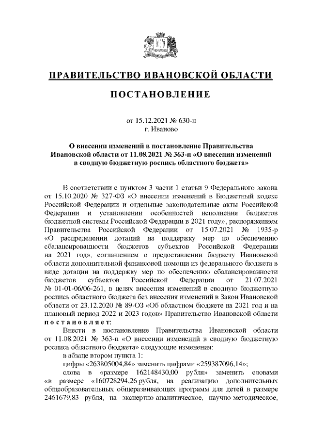 Постановление Правительства Ивановской области от 15.12.2021 N 630-п "О внесении изменений в постановление Правительства Ивановской области от 11.08.2021 N 363-п "О внесении изменений в сводную бюджетную роспись областного бюджета"