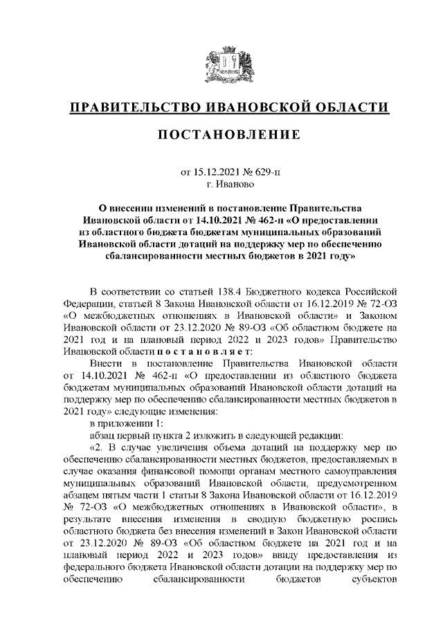 Постановление Правительства Ивановской области от 15.12.2021 N 629-п "О внесении изменений в постановление Правительства Ивановской области от 14.10.2021 N 462-п "О предоставлении из областного бюджета бюджетам муниципальных образований Ивановской области дотаций на поддержку мер по обеспечению сбалансированности местных бюджетов в 2021 году"