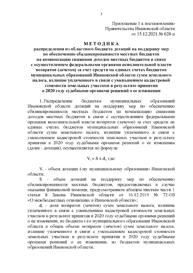 Постановление Правительства Ивановской области от 15.12.2021 N 628-п "О предоставлении дотаций на поддержку мер по обеспечению сбалансированности местных бюджетов на компенсацию снижения доходов местных бюджетов в связи с осуществлением федеральными органами исполнительной власти возвратов (зачетов) за счет средств на единых счетах бюджетов муниципальных образований Ивановской области сумм земельного налога, излишне уплаченного в связи с уменьшением кадастровой стоимости земельных участков в результате принятия в 2020 году судебными органами решений о ее изменении" (вместе с "Методикой распределения из областного бюджета дотаций на поддержку мер по обеспечению сбалансированности местных бюджетов на компенсацию снижения доходов местных бюджетов в связи с осуществлением федеральными органами исполнительной власти возвратов (зачетов) за счет средств на единых счетах бюджетов муниципальных образований Ивановской области сумм земельного налога, излишне уплаченного в связи с уменьшением кадастровой стоимости земельных участков в результате принятия в 2020 году судебными органами решений о ее изменении", "Правилами предоставления из областного бюджета дотаций на поддержку мер по обеспечению сбалансированности местных бюджетов на компенсацию снижения доходов местных бюджетов в связи с осуществлением федеральными органами исполнительной власти возвратов (зачетов) за счет средств на единых счетах бюджетов муниципальных образований Ивановской области сумм земельного налога, излишне уплаченного в связи с уменьшением кадастровой стоимости земельных участков в результате принятия в 2020 году судебными органами решений о ее изменении")