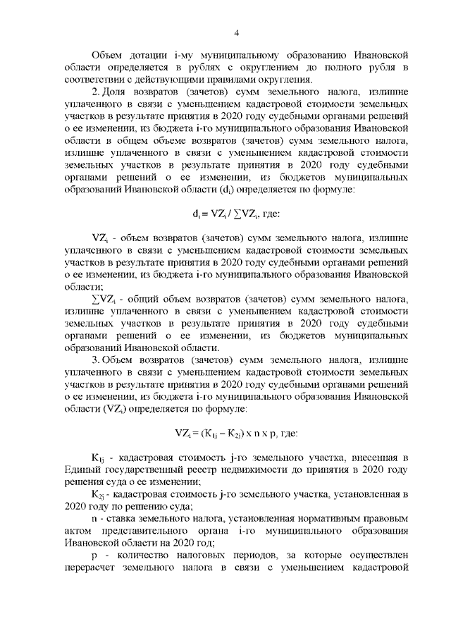 Постановление Правительства Ивановской области от 15.12.2021 N 628-п "О предоставлении дотаций на поддержку мер по обеспечению сбалансированности местных бюджетов на компенсацию снижения доходов местных бюджетов в связи с осуществлением федеральными органами исполнительной власти возвратов (зачетов) за счет средств на единых счетах бюджетов муниципальных образований Ивановской области сумм земельного налога, излишне уплаченного в связи с уменьшением кадастровой стоимости земельных участков в результате принятия в 2020 году судебными органами решений о ее изменении" (вместе с "Методикой распределения из областного бюджета дотаций на поддержку мер по обеспечению сбалансированности местных бюджетов на компенсацию снижения доходов местных бюджетов в связи с осуществлением федеральными органами исполнительной власти возвратов (зачетов) за счет средств на единых счетах бюджетов муниципальных образований Ивановской области сумм земельного налога, излишне уплаченного в связи с уменьшением кадастровой стоимости земельных участков в результате принятия в 2020 году судебными органами решений о ее изменении", "Правилами предоставления из областного бюджета дотаций на поддержку мер по обеспечению сбалансированности местных бюджетов на компенсацию снижения доходов местных бюджетов в связи с осуществлением федеральными органами исполнительной власти возвратов (зачетов) за счет средств на единых счетах бюджетов муниципальных образований Ивановской области сумм земельного налога, излишне уплаченного в связи с уменьшением кадастровой стоимости земельных участков в результате принятия в 2020 году судебными органами решений о ее изменении")