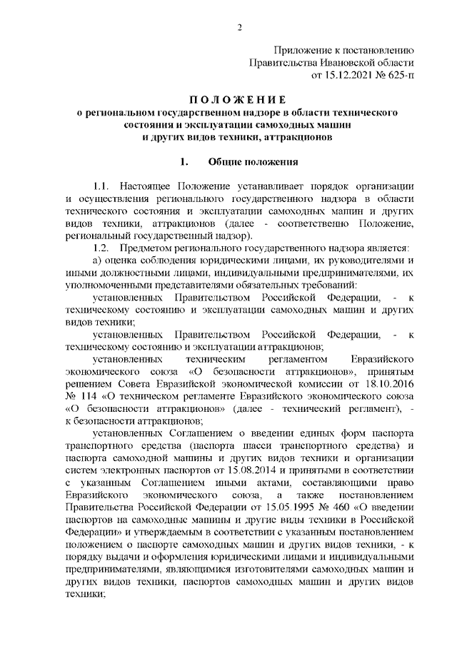 Постановление Правительства Ивановской области от 15.12.2021 N 625-п "Об утверждении Положения о региональном государственном надзоре в области технического состояния и эксплуатации самоходных машин и других видов техники, аттракционов"