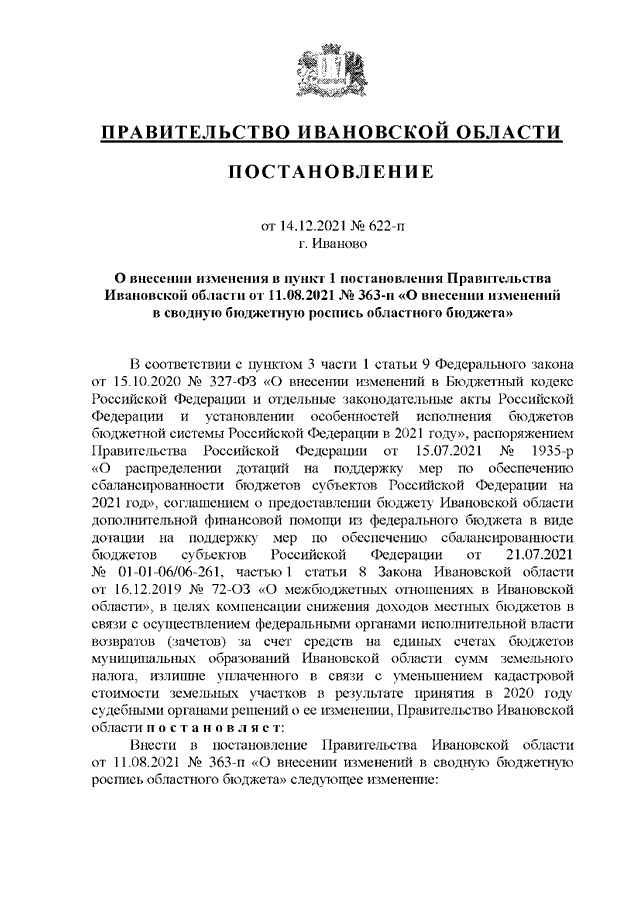 Постановление Правительства Ивановской области от 14.12.2021 N 622-п "О внесении изменения в пункт 1 постановления Правительства Ивановской области от 11.08.2021 N 363-п "О внесении изменений в сводную бюджетную роспись областного бюджета"