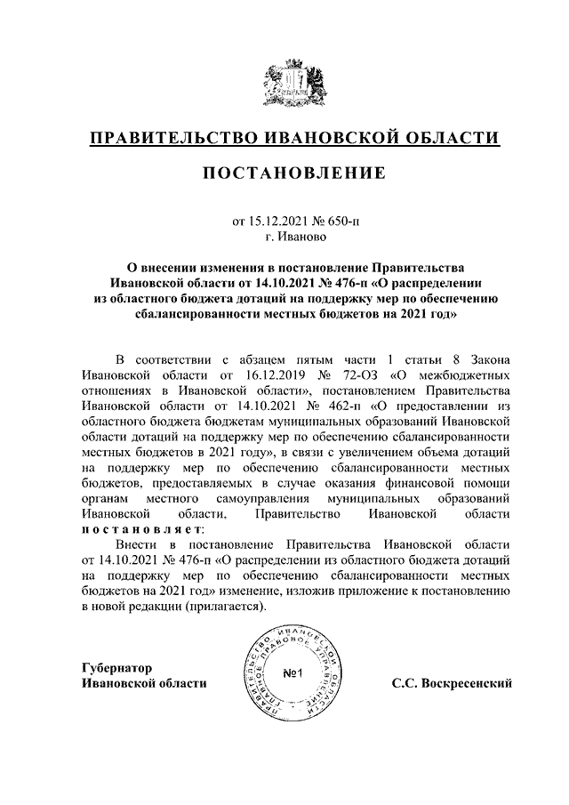 Постановление Правительства Ивановской области от 15.12.2021 N 650-п "О внесении изменения в постановление Правительства Ивановской области от 14.10.2021 N 476-п "О распределении из областного бюджета дотаций на поддержку мер по обеспечению сбалансированности местных бюджетов на 2021 год"