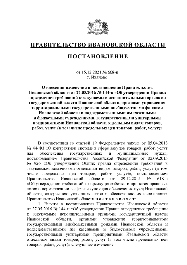 Постановление Правительства Ивановской области от 15.12.2021 N 668-п "О внесении изменения в постановление Правительства Ивановской области от 27.05.2016 N 144-п "Об утверждении Правил определения требований к закупаемым исполнительными органами государственной власти Ивановской области, органами управления территориальными государственными внебюджетными фондами Ивановской области и подведомственными им казенными и бюджетными учреждениями, государственными унитарными предприятиями Ивановской области отдельным видам товаров, работ, услуг (в том числе предельных цен товаров, работ, услуг)"