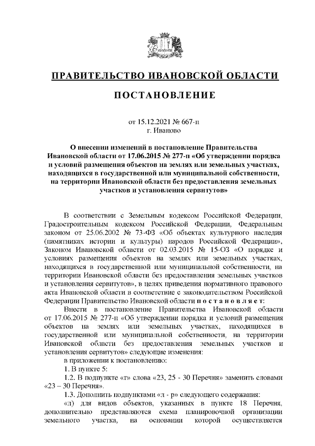Постановление Правительства Ивановской области от 15.12.2021 N 667-п "О внесении изменений в постановление Правительства Ивановской области от 17.06.2015 N 277-п "Об утверждении порядка и условий размещения объектов на землях или земельных участках, находящихся в государственной или муниципальной собственности, на территории Ивановской области без предоставления земельных участков и установления сервитутов"