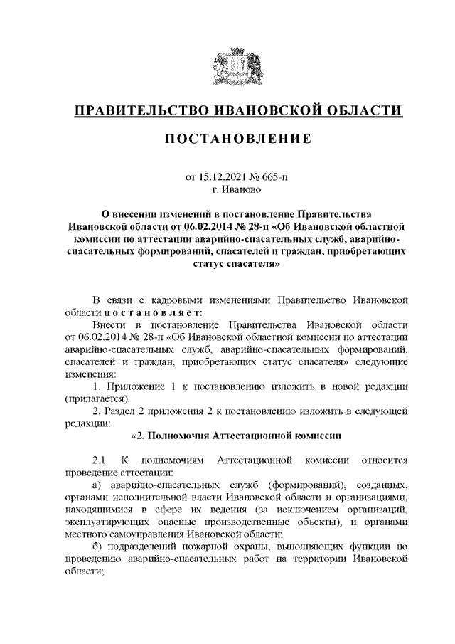 Постановление Правительства Ивановской области от 15.12.2021 N 665-п "О внесении изменений в постановление Правительства Ивановской области от 06.02.2014 N 28-п "Об Ивановской областной комиссии по аттестации аварийно-спасательных служб, аварийно-спасательных формирований, спасателей и граждан, приобретающих статус спасателя"