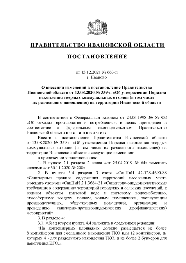 Постановление Правительства Ивановской области от 15.12.2021 N 663-п "О внесении изменений в постановление Правительства Ивановской области от 13.08.2020 N 359-п "Об утверждении Порядка накопления твердых коммунальных отходов (в том числе их раздельного накопления) на территории Ивановской области"