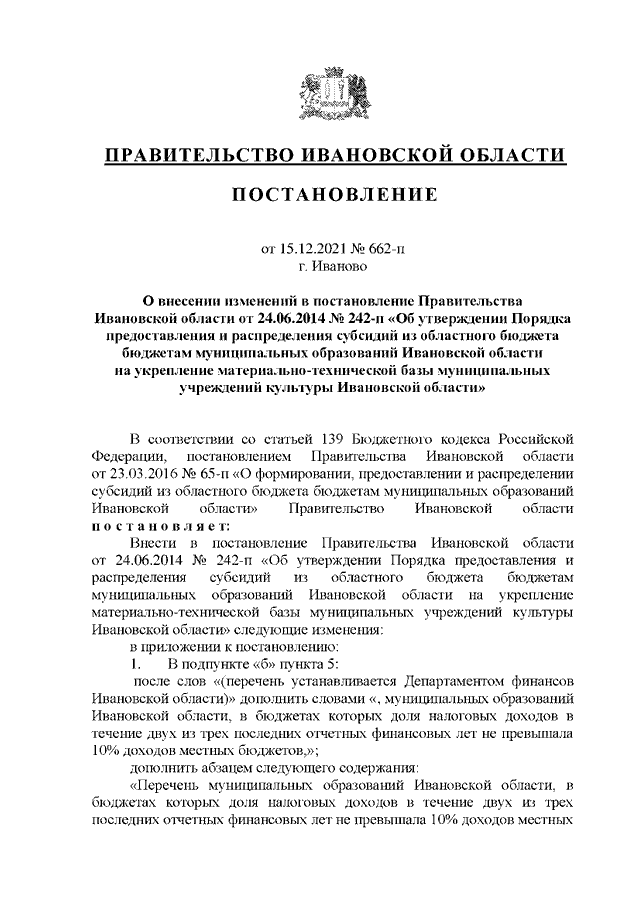 Постановление Правительства Ивановской области от 15.12.2021 N 662-п "О внесении изменений в постановление Правительства Ивановской области от 24.06.2014 N 242-п "Об утверждении Порядка предоставления и распределения субсидий из областного бюджета бюджетам муниципальных образований Ивановской области на укрепление материально-технической базы муниципальных учреждений культуры Ивановской области"