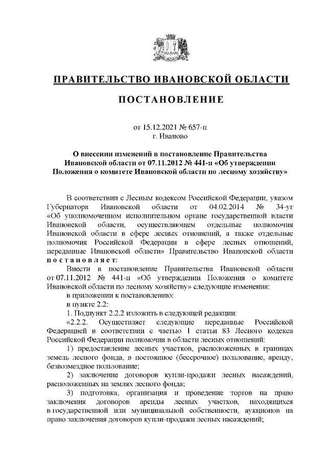 Постановление Правительства Ивановской области от 15.12.2021 N 657-п "О внесении изменений в постановление Правительства Ивановской области от 07.11.2012 N 441-п "Об утверждении Положения о комитете Ивановской области по лесному хозяйству"