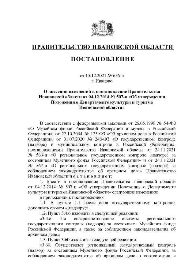 Постановление Правительства Ивановской области от 15.12.2021 N 656-п "О внесении изменений в постановление Правительства Ивановской области от 04.12.2014 N 507-п "Об утверждении Положения о Департаменте культуры и туризма Ивановской области"