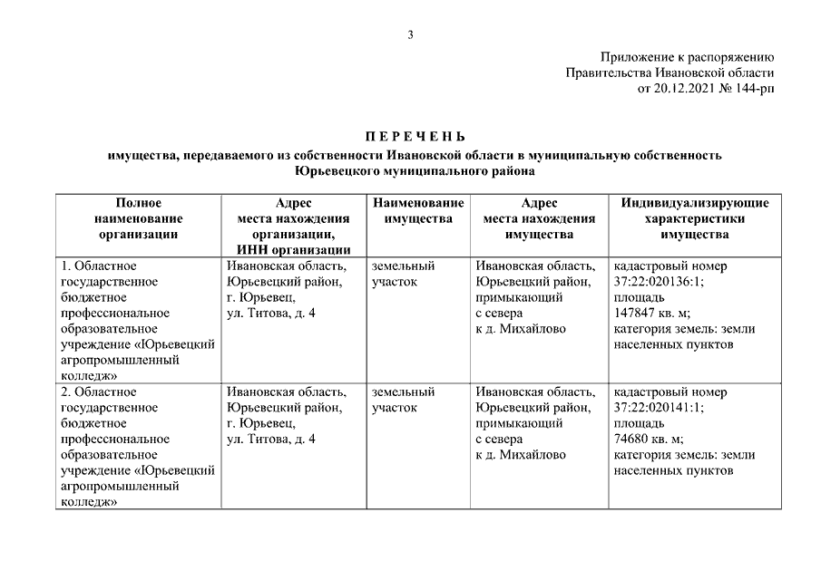 Распоряжение Правительства Ивановской области от 20.12.2021 N 144-рп "О передаче земельных участков из собственности Ивановской области в муниципальную собственность Юрьевецкого муниципального района"