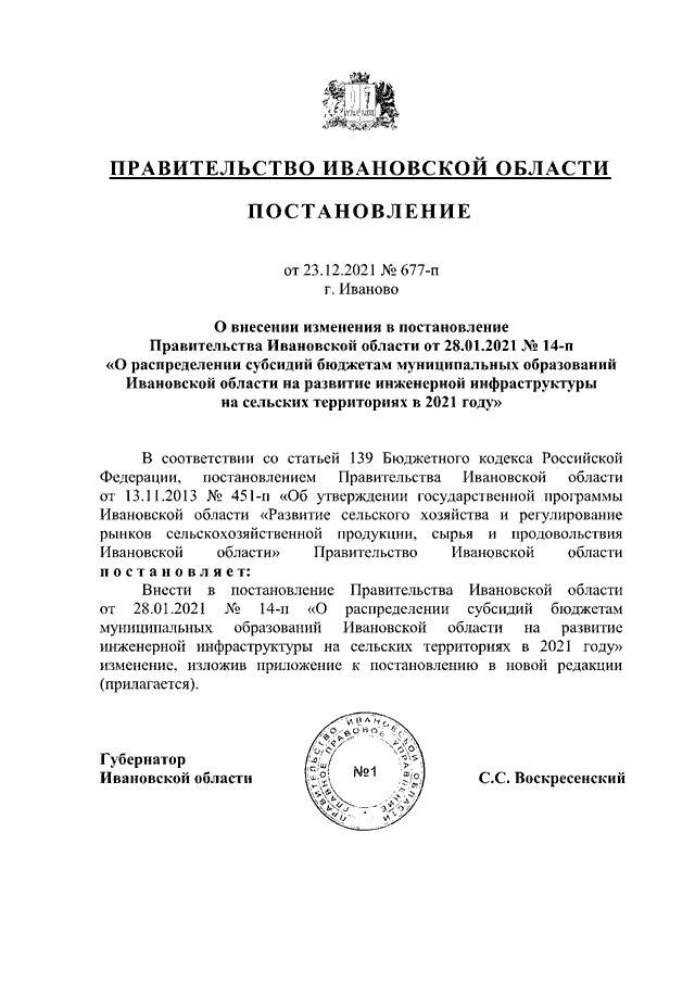 Постановление Правительства Ивановской области от 23.12.2021 N 677-п "О внесении изменения в постановление Правительства Ивановской области от 28.01.2021 N 14-п "О распределении субсидий бюджетам муниципальных образований Ивановской области на развитие инженерной инфраструктуры на сельских территориях в 2021 году"
