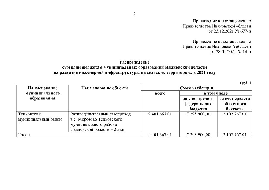 Постановление Правительства Ивановской области от 23.12.2021 N 677-п "О внесении изменения в постановление Правительства Ивановской области от 28.01.2021 N 14-п "О распределении субсидий бюджетам муниципальных образований Ивановской области на развитие инженерной инфраструктуры на сельских территориях в 2021 году"