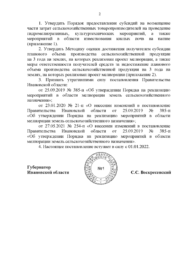 Постановление Правительства Ивановской области от 23.12.2021 N 685-п "Об утверждении Порядка предоставления субсидий на возмещение части затрат сельскохозяйственных товаропроизводителей на проведение гидромелиоративных, культуртехнических мероприятий, а также мероприятий в области известкования кислых почв на пашне и Методики оценки достижения получателем субсидии планового объема производства сельскохозяйственной продукции на 3 года на землях, на которых реализован проект мелиорации, а также мер ответственности получателей средств за недостижение планового объема производства сельскохозяйственной продукции на 3 года на землях, на которых реализован проект мелиорации"