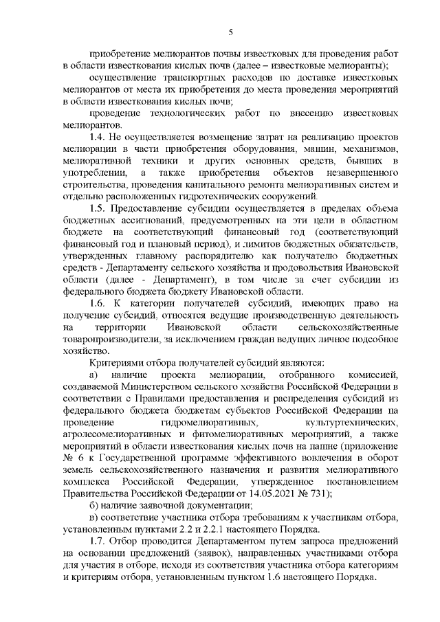 Постановление Правительства Ивановской области от 23.12.2021 N 685-п "Об утверждении Порядка предоставления субсидий на возмещение части затрат сельскохозяйственных товаропроизводителей на проведение гидромелиоративных, культуртехнических мероприятий, а также мероприятий в области известкования кислых почв на пашне и Методики оценки достижения получателем субсидии планового объема производства сельскохозяйственной продукции на 3 года на землях, на которых реализован проект мелиорации, а также мер ответственности получателей средств за недостижение планового объема производства сельскохозяйственной продукции на 3 года на землях, на которых реализован проект мелиорации"