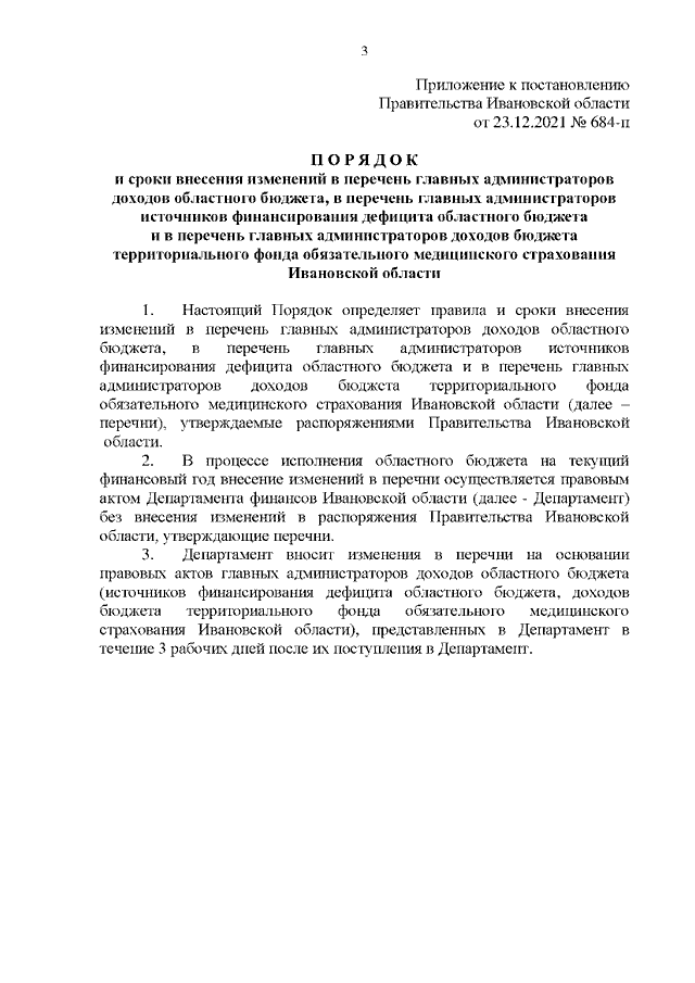 Постановление Правительства Ивановской области от 23.12.2021 N 684-п "О порядке и сроках внесения изменений в перечень главных администраторов доходов областного бюджета, в перечень главных администраторов источников финансирования дефицита областного бюджета и в перечень главных администраторов доходов бюджета территориального фонда обязательного медицинского страхования Ивановской области"