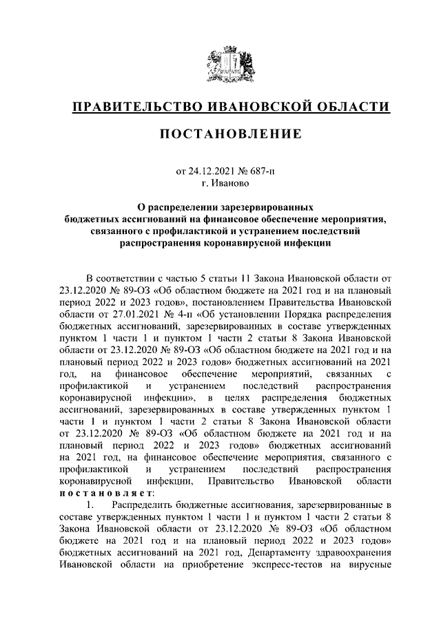 Постановление Правительства Ивановской области от 24.12.2021 N 687-п "О распределении зарезервированных бюджетных ассигнований на финансовое обеспечение мероприятия, связанного с профилактикой и устранением последствий распространения коронавирусной инфекции"