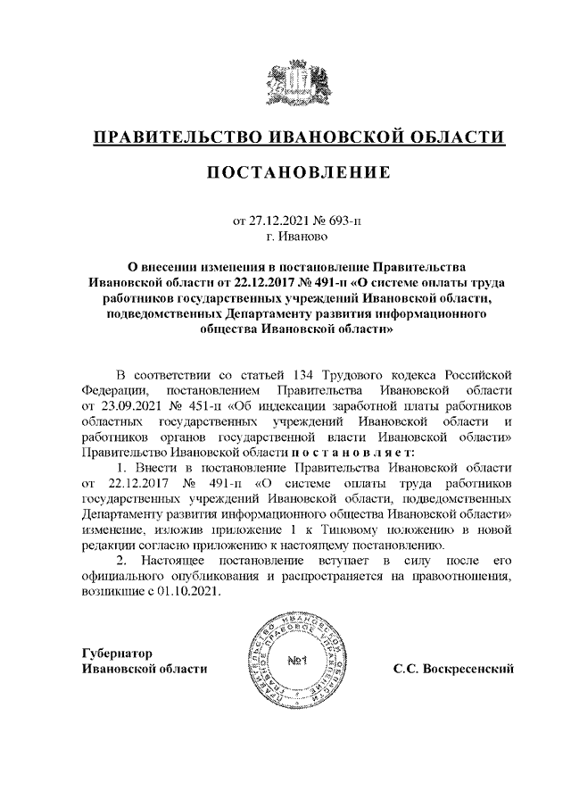 Постановление Правительства Ивановской области от 27.12.2021 N 693-п "О внесении изменения в постановление Правительства Ивановской области от 22.12.2017 N 491-п "О системе оплаты труда работников государственных учреждений Ивановской области, подведомственных Департаменту развития информационного общества Ивановской области"