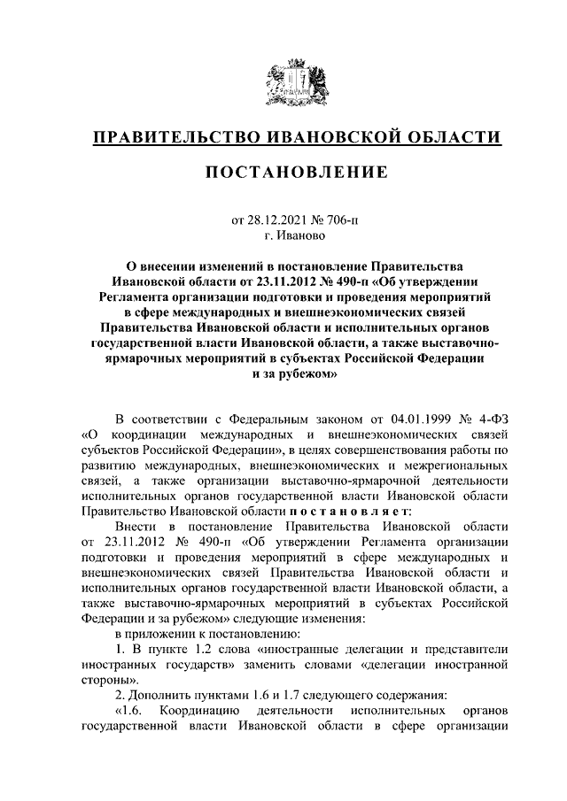 Постановление Правительства Ивановской области от 28.12.2021 N 706-п "О внесении изменений в постановление Правительства Ивановской области от 23.11.2012 N 490-п "Об утверждении Регламента организации подготовки и проведения мероприятий в сфере международных и внешнеэкономических связей Правительства Ивановской области и исполнительных органов государственной власти Ивановской области, а также выставочно-ярмарочных мероприятий в субъектах Российской Федерации и за рубежом"