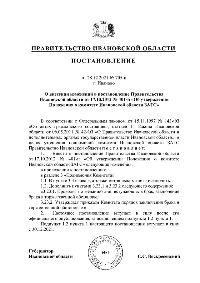 Постановление Правительства Ивановской области от 28.12.2021 N 705-п "О внесении изменений в постановление Правительства Ивановской области от 17.10.2012 N 401-п "Об утверждении Положения о комитете Ивановской области ЗАГС"