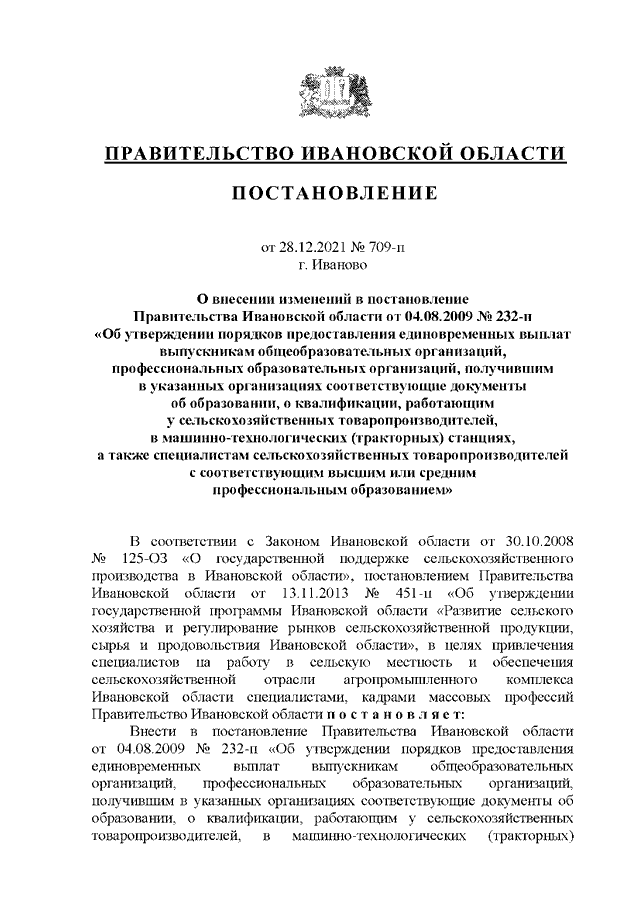 Постановление Правительства Ивановской области от 28.12.2021 N 709-п "О внесении изменений в постановление Правительства Ивановской области от 04.08.2009 N 232-п "Об утверждении порядков предоставления единовременных выплат выпускникам общеобразовательных организаций, профессиональных образовательных организаций, получившим в указанных организациях соответствующие документы об образовании, о квалификации, работающим у сельскохозяйственных товаропроизводителей, в машинно-технологических (тракторных) станциях, а также специалистам сельскохозяйственных товаропроизводителей с соответствующим высшим или средним профессиональным образованием"