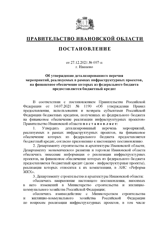 Постановление Правительства Ивановской области от 27.12.2021 N 697-п "Об утверждении детализированного перечня мероприятий, реализуемых в рамках инфраструктурных проектов, на финансовое обеспечение которых из федерального бюджета предоставляется бюджетный кредит"