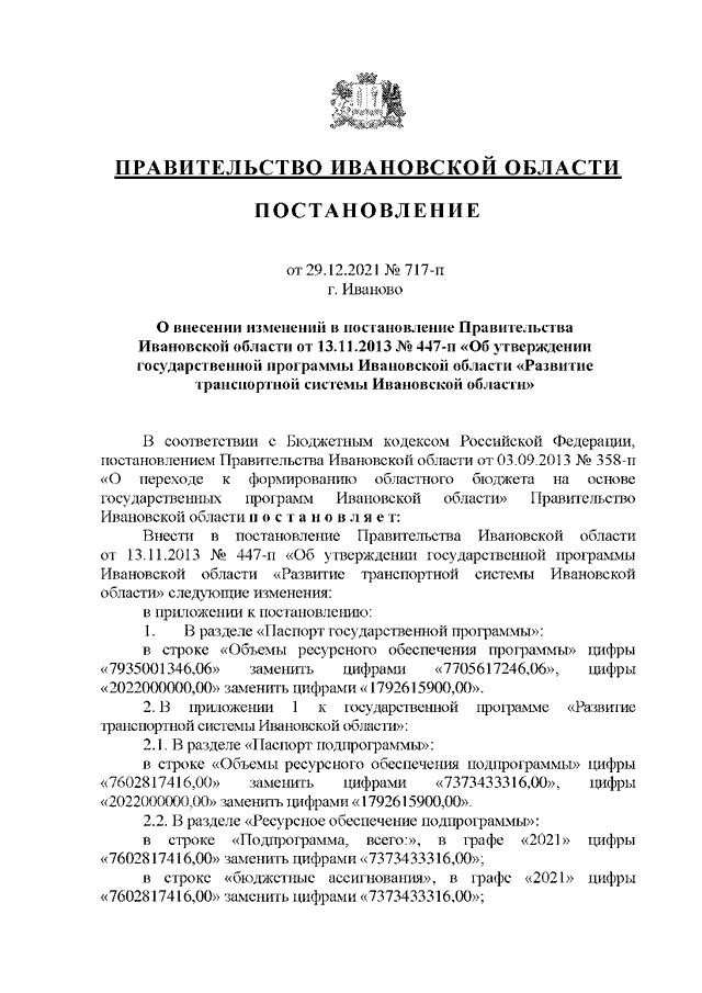 Постановление Правительства Ивановской области от 29.12.2021 N 717-п "О внесении изменений в постановление Правительства Ивановской области от 13.11.2013 N 447-п "Об утверждении государственной программы Ивановской области "Развитие транспортной системы Ивановской области"