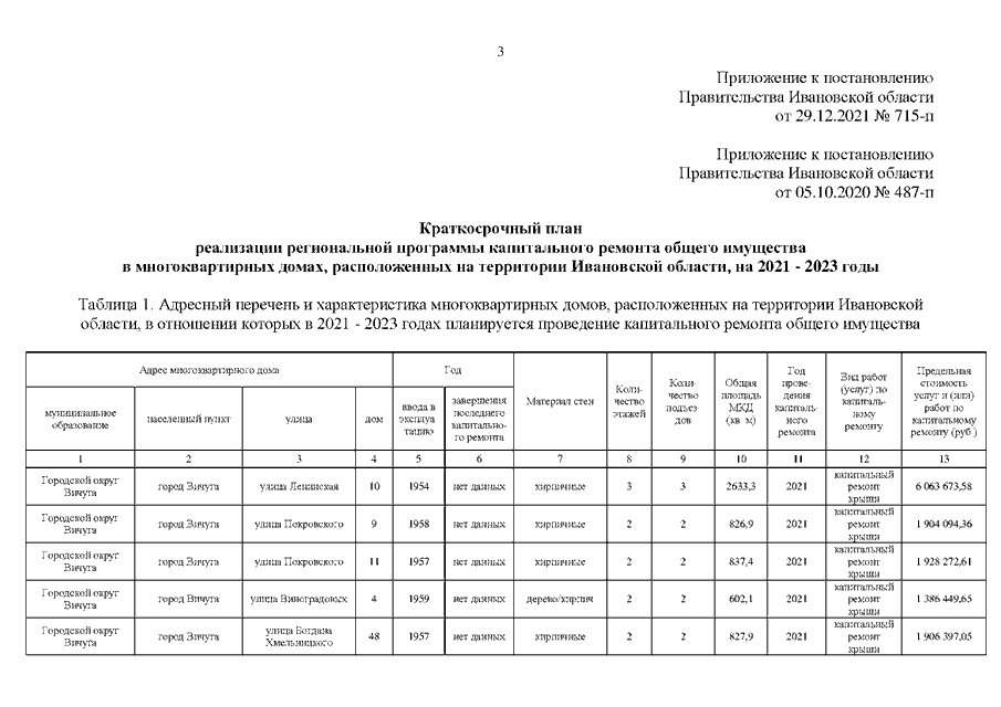 Постановление Правительства Ивановской области от 29.12.2021 N 715-п "О внесении изменения в постановление Правительства Ивановской области от 05.10.2020 N 487-п "Об утверждении краткосрочного плана реализации региональной программы капитального ремонта общего имущества в многоквартирных домах, расположенных на территории Ивановской области, на 2021 - 2023 годы"