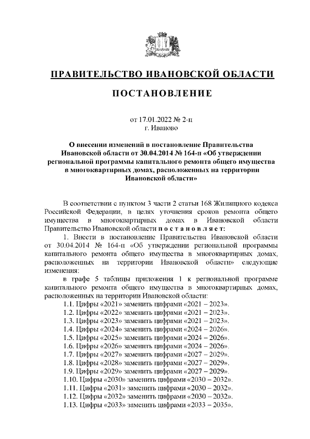 Постановление Правительства Ивановской области от 17.01.2022 N 2-п "О внесении изменений в постановление Правительства Ивановской области от 30.04.2014 N 164-п "Об утверждении региональной программы капитального ремонта общего имущества в многоквартирных домах, расположенных на территории Ивановской области"