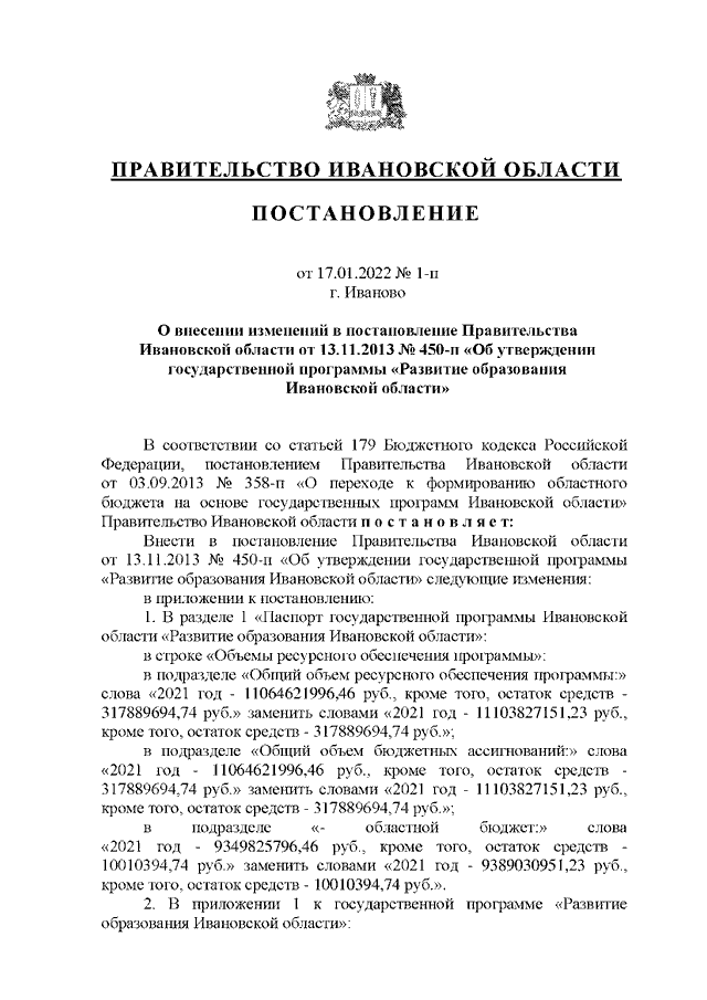 Постановление Правительства Ивановской области от 17.01.2022 N 1-п "О внесении изменений в постановление Правительства Ивановской области от 13.11.2013 N 450-п "Об утверждении государственной программы "Развитие образования Ивановской области"