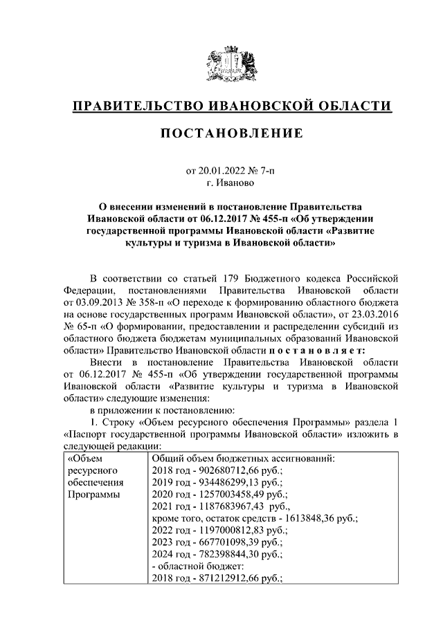 Постановление Правительства Ивановской области от 20.01.2022 N 7-п "О внесении изменений в постановление Правительства Ивановской области от 06.12.2017 N 455-п "Об утверждении государственной программы Ивановской области "Развитие культуры и туризма в Ивановской области" (вместе с "Порядком предоставления и распределения субсидий бюджетам муниципальных образований Ивановской области на реализацию мероприятий по модернизации библиотек в части комплектования книжных фондов библиотек муниципальных образований", "Порядком предоставления и распределения субсидий бюджетам муниципальных образований на техническое оснащение муниципальных музеев", "Порядком предоставления и распределения субсидий бюджетам муниципальных образований Ивановской области на создание и модернизацию учреждений культурно-досугового типа в сельской местности", "Порядком предоставления и распределения субсидий бюджетам муниципальных образований Ивановской области на создание центров культурного развития в городах с числом жителей до 300 тысяч человек")