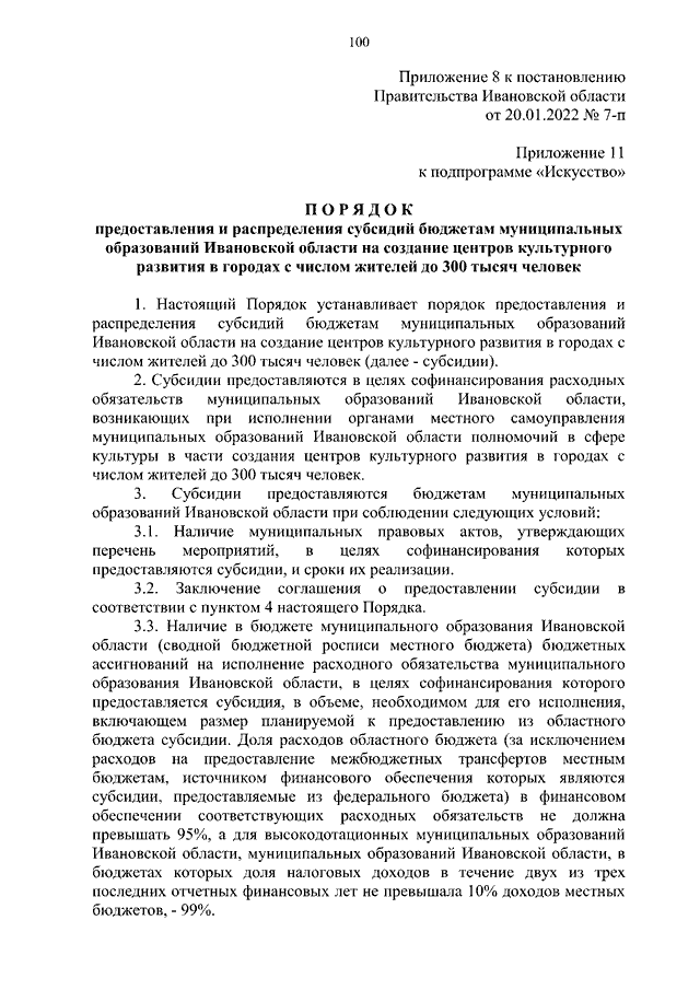 Постановление Правительства Ивановской области от 20.01.2022 N 7-п "О внесении изменений в постановление Правительства Ивановской области от 06.12.2017 N 455-п "Об утверждении государственной программы Ивановской области "Развитие культуры и туризма в Ивановской области" (вместе с "Порядком предоставления и распределения субсидий бюджетам муниципальных образований Ивановской области на реализацию мероприятий по модернизации библиотек в части комплектования книжных фондов библиотек муниципальных образований", "Порядком предоставления и распределения субсидий бюджетам муниципальных образований на техническое оснащение муниципальных музеев", "Порядком предоставления и распределения субсидий бюджетам муниципальных образований Ивановской области на создание и модернизацию учреждений культурно-досугового типа в сельской местности", "Порядком предоставления и распределения субсидий бюджетам муниципальных образований Ивановской области на создание центров культурного развития в городах с числом жителей до 300 тысяч человек")