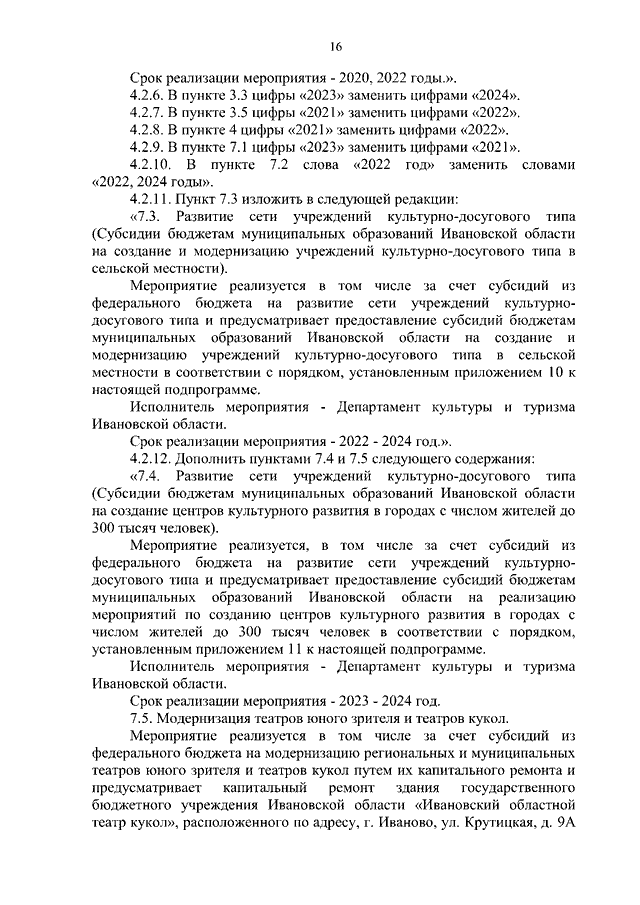 Постановление Правительства Ивановской области от 20.01.2022 N 7-п "О внесении изменений в постановление Правительства Ивановской области от 06.12.2017 N 455-п "Об утверждении государственной программы Ивановской области "Развитие культуры и туризма в Ивановской области" (вместе с "Порядком предоставления и распределения субсидий бюджетам муниципальных образований Ивановской области на реализацию мероприятий по модернизации библиотек в части комплектования книжных фондов библиотек муниципальных образований", "Порядком предоставления и распределения субсидий бюджетам муниципальных образований на техническое оснащение муниципальных музеев", "Порядком предоставления и распределения субсидий бюджетам муниципальных образований Ивановской области на создание и модернизацию учреждений культурно-досугового типа в сельской местности", "Порядком предоставления и распределения субсидий бюджетам муниципальных образований Ивановской области на создание центров культурного развития в городах с числом жителей до 300 тысяч человек")