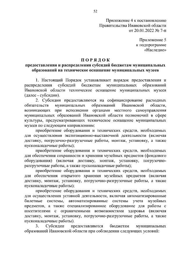 Постановление Правительства Ивановской области от 20.01.2022 N 7-п "О внесении изменений в постановление Правительства Ивановской области от 06.12.2017 N 455-п "Об утверждении государственной программы Ивановской области "Развитие культуры и туризма в Ивановской области" (вместе с "Порядком предоставления и распределения субсидий бюджетам муниципальных образований Ивановской области на реализацию мероприятий по модернизации библиотек в части комплектования книжных фондов библиотек муниципальных образований", "Порядком предоставления и распределения субсидий бюджетам муниципальных образований на техническое оснащение муниципальных музеев", "Порядком предоставления и распределения субсидий бюджетам муниципальных образований Ивановской области на создание и модернизацию учреждений культурно-досугового типа в сельской местности", "Порядком предоставления и распределения субсидий бюджетам муниципальных образований Ивановской области на создание центров культурного развития в городах с числом жителей до 300 тысяч человек")