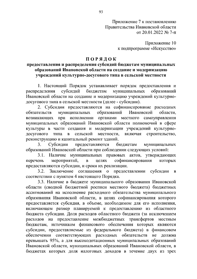 Постановление Правительства Ивановской области от 20.01.2022 N 7-п "О внесении изменений в постановление Правительства Ивановской области от 06.12.2017 N 455-п "Об утверждении государственной программы Ивановской области "Развитие культуры и туризма в Ивановской области" (вместе с "Порядком предоставления и распределения субсидий бюджетам муниципальных образований Ивановской области на реализацию мероприятий по модернизации библиотек в части комплектования книжных фондов библиотек муниципальных образований", "Порядком предоставления и распределения субсидий бюджетам муниципальных образований на техническое оснащение муниципальных музеев", "Порядком предоставления и распределения субсидий бюджетам муниципальных образований Ивановской области на создание и модернизацию учреждений культурно-досугового типа в сельской местности", "Порядком предоставления и распределения субсидий бюджетам муниципальных образований Ивановской области на создание центров культурного развития в городах с числом жителей до 300 тысяч человек")