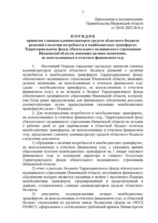 Постановление Правительства Ивановской области от 20.01.2022 N 6-п "Об утверждении Порядка принятия главным администратором средств областного бюджета решений о наличии потребности в межбюджетных трансфертах Территориальному фонду обязательного медицинского страхования Ивановской области, имеющих целевое назначение, не использованных в отчетном финансовом году"