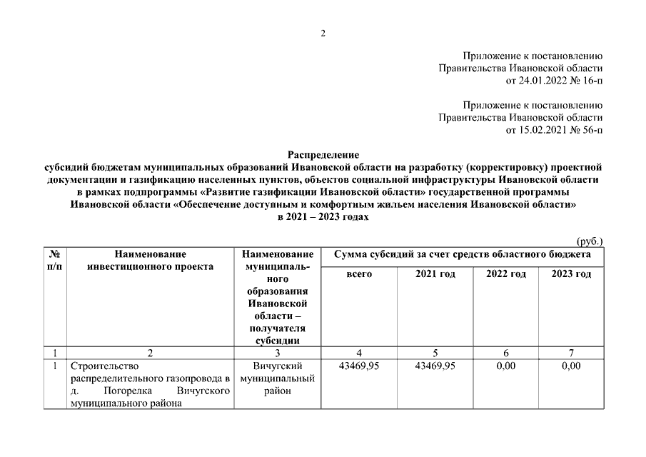 Постановление Правительства Ивановской области от 24.01.2022 N 16-п "О внесении изменения в постановление Правительства Ивановской области от 15.02.2021 N 56-п "О распределении субсидий бюджетам муниципальных образований Ивановской области на разработку (корректировку) проектной документации и газификацию населенных пунктов, объектов социальной инфраструктуры Ивановской области в рамках подпрограммы "Развитие газификации Ивановской области" государственной программы Ивановской области "Обеспечение доступным и комфортным жильем населения Ивановской области" в 2021 - 2023 годах"