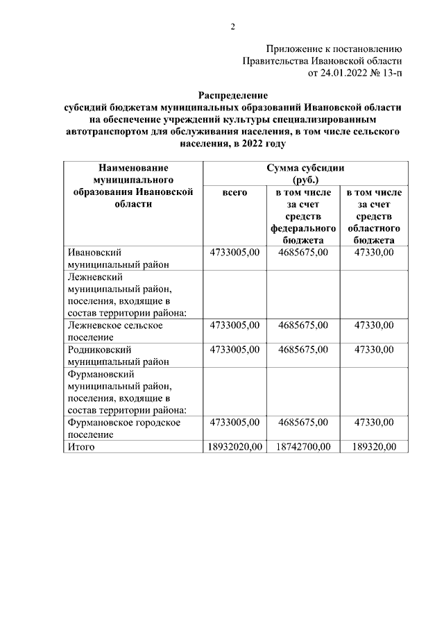 Постановление Правительства Ивановской области от 24.01.2022 N 13-п "О распределении субсидий бюджетам муниципальных образований Ивановской области на обеспечение учреждений культуры специализированным автотранспортом для обслуживания населения, в том числе сельского населения, в 2022 году"