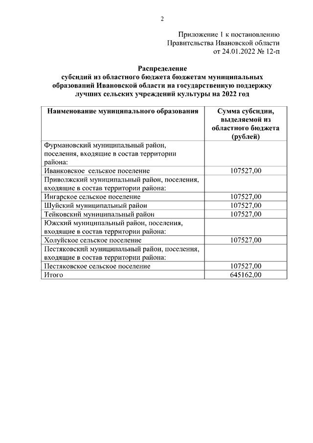 Постановление Правительства Ивановской области от 24.01.2022 N 12-п "О распределении субсидий из областного бюджета бюджетам муниципальных образований Ивановской области на государственную поддержку лучших сельских учреждений культуры и государственную поддержку лучших работников сельских учреждений культуры на 2022 год"
