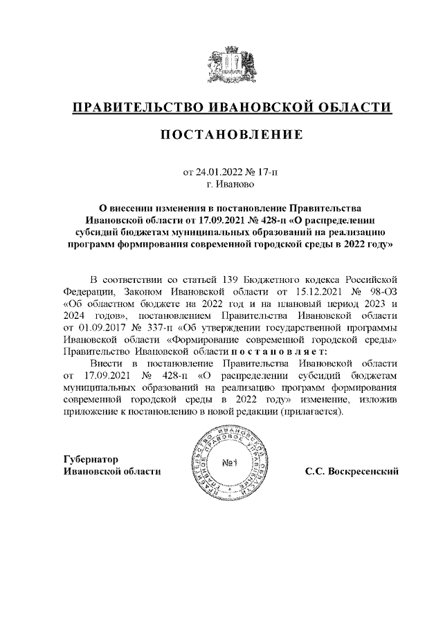 Постановление Правительства Ивановской области от 24.01.2022 N 17-п "О внесении изменения в постановление Правительства Ивановской области от 17.09.2021 N 428-п "О распределении субсидий бюджетам муниципальных образований на реализацию программ формирования современной городской среды в 2022 году"
